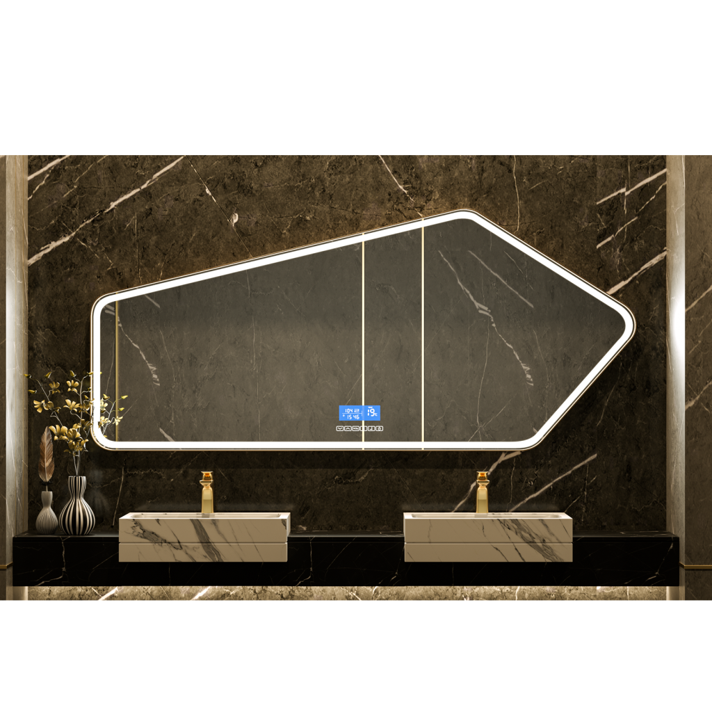 SM001-Stainless steel series-Irregular oval Tri-color LED lights bathroom mirror 01